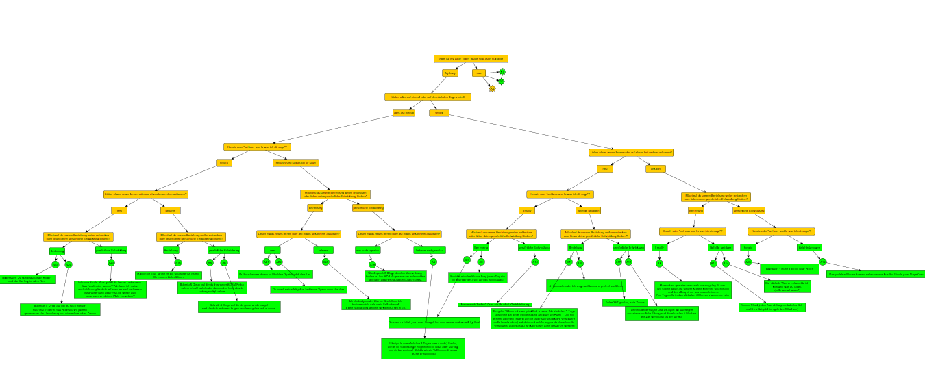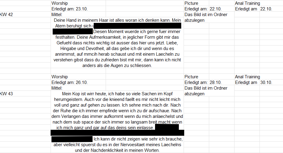 Ich wollte meinem Freund eine "gute Sub" werden, aber ziemlich schnell war klar, dass ich eine viel bessere Domme sein kann. Jetzt stehe ich hier mit viel Lust, Selbstbewußsein und Leidenschaft für die bisher gemachten Erfahrungen, aber mit immer noch viel zu wenig Ideen für die Zukunft. Ich bin sehr neu im BDSM und zu meinen Lieblingsbereichen - Dominanz und Disziplin- finde ich wenig ansprechende Informationen. Darum wollte ich dich fragen, ob du dein Aufgaben-Flussdiagramm mit mir in einem lesbaren Format teilen würdest?